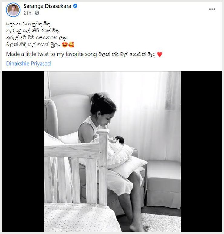මේ ඔයාලට ගෙන එන්නේ පුංචි දෝනිව තුරුල් කරගෙන දිනක්ෂි කියූ ආදරණිය කතාවක් සාරංග මෙන්න මේ ආකාරයෙන් තමයි තම සමාජ මාධ්යට එකතු කරලා තිබුනේ. මේ සටහන තමයි පහලින් ඔයාලට බලන්න පුළුවන් වෙන්නේ. ඒ වගේම ඔවුන්ගේ ආදරණිය කැදැල්ලට හැමදාම සතුටෙන් ඉන්න ලැබෙන්න කියලත් අපි හැමෝම ප්රර්ථනා කරමු.