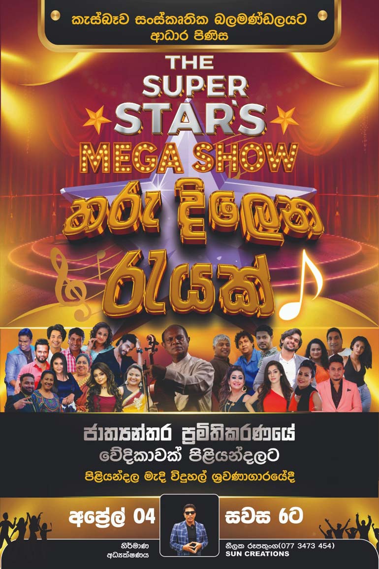 News එක තමයි කැස්බෑව සංස්කෘතික බල මණ්ඩලය ට ආධාර පිණිස The Super Stars Mega Show තරු දිලෙන රැයක් ජාත්යන්තර ප්රමිතිකරණයේ වේදිකාවක් පිළියන්දලට එනවා කියන එක.