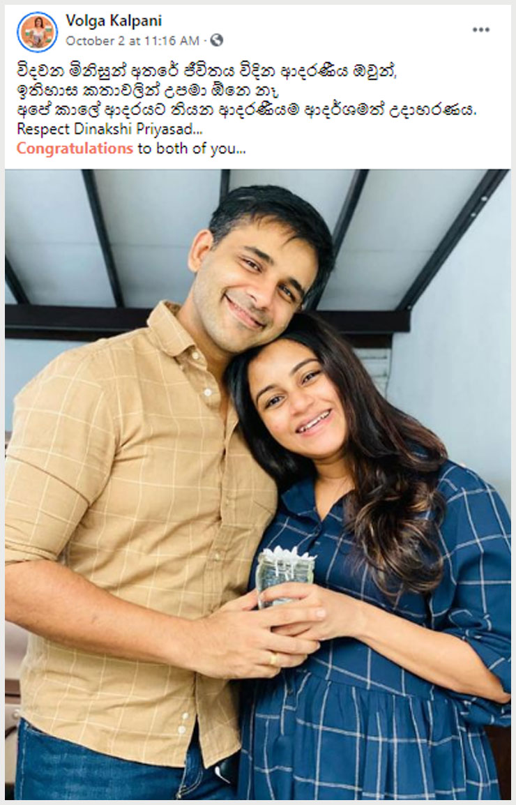 ඇය සිය මුහුණු පොත ට එක්ල සටහනක් මේ වෙද්දි හැමෝගෙම අවධානයට යොමුවෙලා තියෙනවා. එහේ දිනක්ෂි සහ සාරංග පිළිබඳව ඇය එකතු කරපු සටහනක්. එහි සඳහන්ව තිබුනේ මෙලෙසින්. විඳවන මිනිසුන් අතරේ ජීවිතය වූ විඳින ආදරණීය ඔවුන් ඉතිහාස කතා තුළින්උපමා ඕනි නෑ අපේ කාලේ ආදරයට තියන ඒ ආදරණීයම ආදර්ශමත් උදාහරණය. රෙස්පෙක්ට් දිනක්ෂි ප්රියසාද් . congratulations both of you