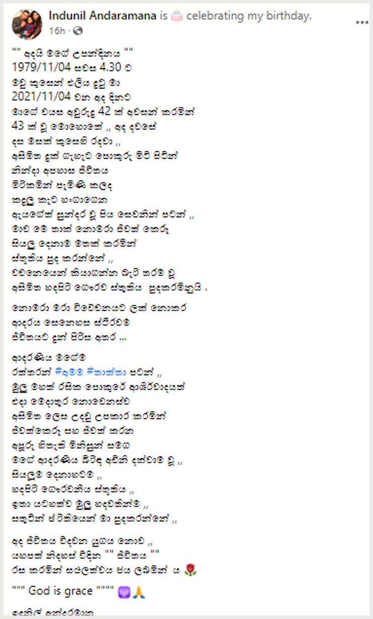 43වන උපන්දිනය සමරමින් ඉඳුනිල් අන්දරමාන තැබූ ආදරණිය සටහන.