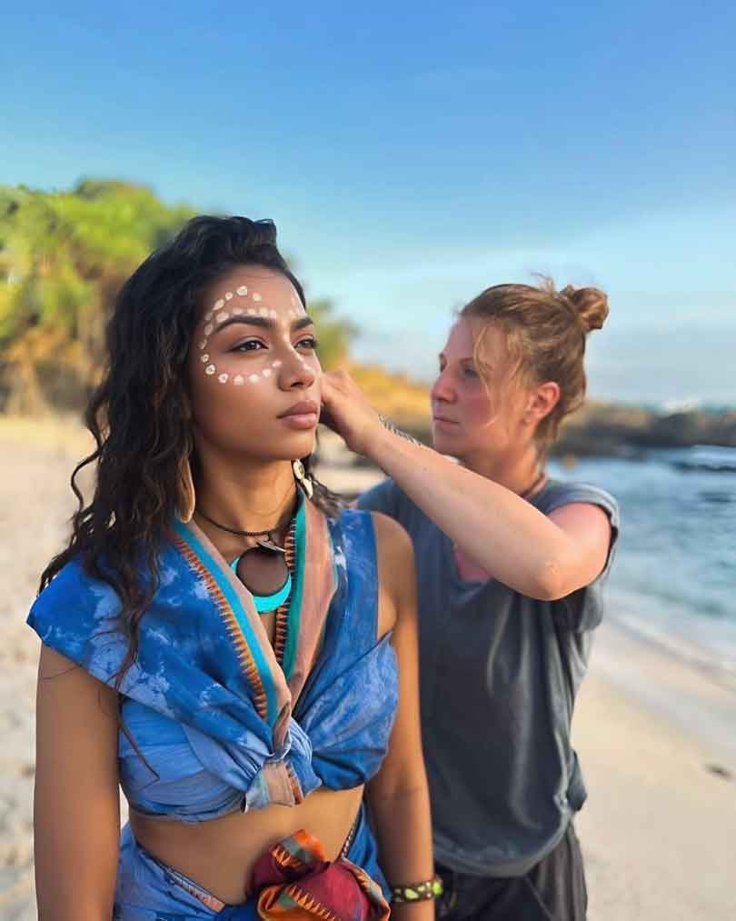 එයාලා  මේකප් පාවිච්චි කරනවා හරිම අඩුයි. අපේ ස්වභාවික පෙනුම තමයි රංගනයේදී මතු කරගන්න උත්සාහ කරන්නේ .එයාලා කියනවා ස්ක්‍රීන් එකේදි මාව දකිද්දි හරිම ලස්සනයි කියලා. තොල් ලොකුයි ලස්සනයි කියලත් කීවා. මට Big eyes  කියලා විහිළු  කළා ..එයාලා  නිතරම කියපු දෙයක් තමයි ඔයාගේ ලොකු ඇස් දෙක ස්ක්‍රීන් එකට ලස්සනට පෙනෙනවා කියලා.මගේ හිනාවත් ලස්සනයි කිව්වා.මූණ, සම ලස්සනයි කිව්වා කොණ්ඩෙ ලස්සනයි කිව්වා මගෙන් ඇහුවෙ  හැමතිස්සෙම ඔයා කොහොමද ලස්සනට ඉන්නේ කියලා. එකම විදියට ඔයා ඔයාගේ ලස්සන තියාගෙන ඉන්නේ කොහොමද කියලා. හැම වෙලාවේම ඔයා කොහොම දැක්කත් ලස්සනයි කියලා කීවා. එයාලා කොහොමත් අපේ හමේ පාටට හරි ආසයි. එයාලගේ ඇස් නිල් පාටයි. දුඹුරුපාටයි.අපේ ඇස් කළු පාටයිනේ.එයාලා කළු පාට ඇස් වලට හරි ආසයි. මේකප්  කරද්දි කළු කොණ්ඩෙ හරි ලස්සනයි කියලා අතගාලා බැලුවා . එයාලගේ කලාකරුවන් ඇත්තටම මල්ටි මිලියනස්ලා කියලා එයාලා කියන්නෙ. ඒ කලාකරුවන් වුණත් ටිකක් තමන් ගැන ලොකු තක්සේරුවකින් ඉන්න අය කියලා කීවා. එයාලා, එයාලා අතරම ලොකු තරගයක් තියෙනවලු. මේ චිත්‍රපටයේ දිනිඳු මියුසික් ඩාන්සින් දෙකම කළා . දිනිඳුට මියුසික් ඩාන්සින් හොඳට පුළුවන් කියලා දැනගත්තම ඒවටත්  එයාම යොදා ගත්තා.